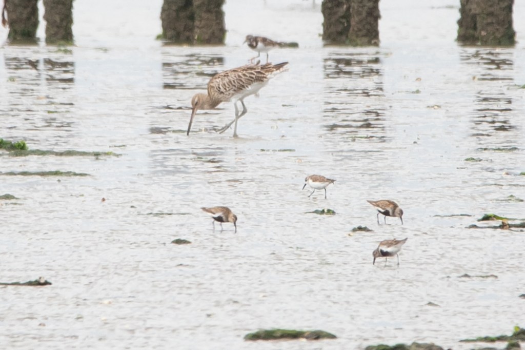 Ik zie Tureluurs, Bontbekplevieren, Bonte Strandlopers, Steenloper. Er loopt genoeg maar deze herken ik allemaal. Misschien zit hij verder dan we denken en ik richt mijn beeld op het stuk slik achter de rij met paaltjes. Niet veel later krijg ik een klein strandlopertje in beeld, heel gedrongen, witte buik, forse snavel die licht afgebogen is aan het eind. Hij loopt achter de paaltjes! Roep ik, maar tegelijkertijd hadden de vogelaars hem verderop ook net in beeld gekregen. Na wat bewijsplaatjes geschoten te hebben begon de lange reis terug naar huis.