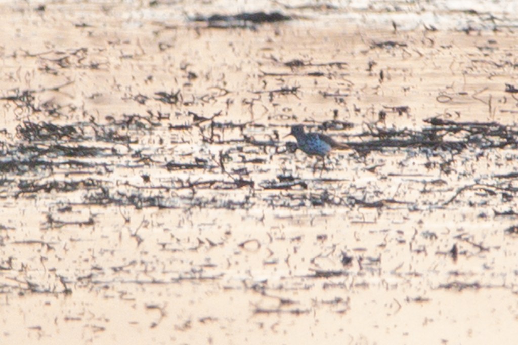 De tijd liep langzaam door, het was 20:45 uur geweest en de zon begon hard te zakken. Van die Oeverloper? Geen spoor te bekennen. Ja, de gewone, waarvan er een stuk of 8 liepen maar die had ik allemaal al minstens 20x bekeken in de hoop dat ze toch niet opeens stipjes op de borst hadden. En dan, precies op zo’n moment dat je eigenlijk op wilt geven en naar huis wilt gaan check ik toch nog één keer de groep. Ze lopen nu wat meer naar voren maar het licht wordt echt snel minder. Toch zie ik opeens midden in beeld eentje die stippen op de borst heeft en een stuk kleiner oogt. Ik knipper nog een paar keer maar hij loopt er toch echt! De Amerikaanse Oeverloper! Het kwam opeens toch goed en ook enkele andere vogelaars die hem nog niet gezien hadden kregen hem nog te zien. Wat een goedmakertje om hem dan zelf weer terug te vinden. Nu kan ik al helemaal tevreden naar huis.
